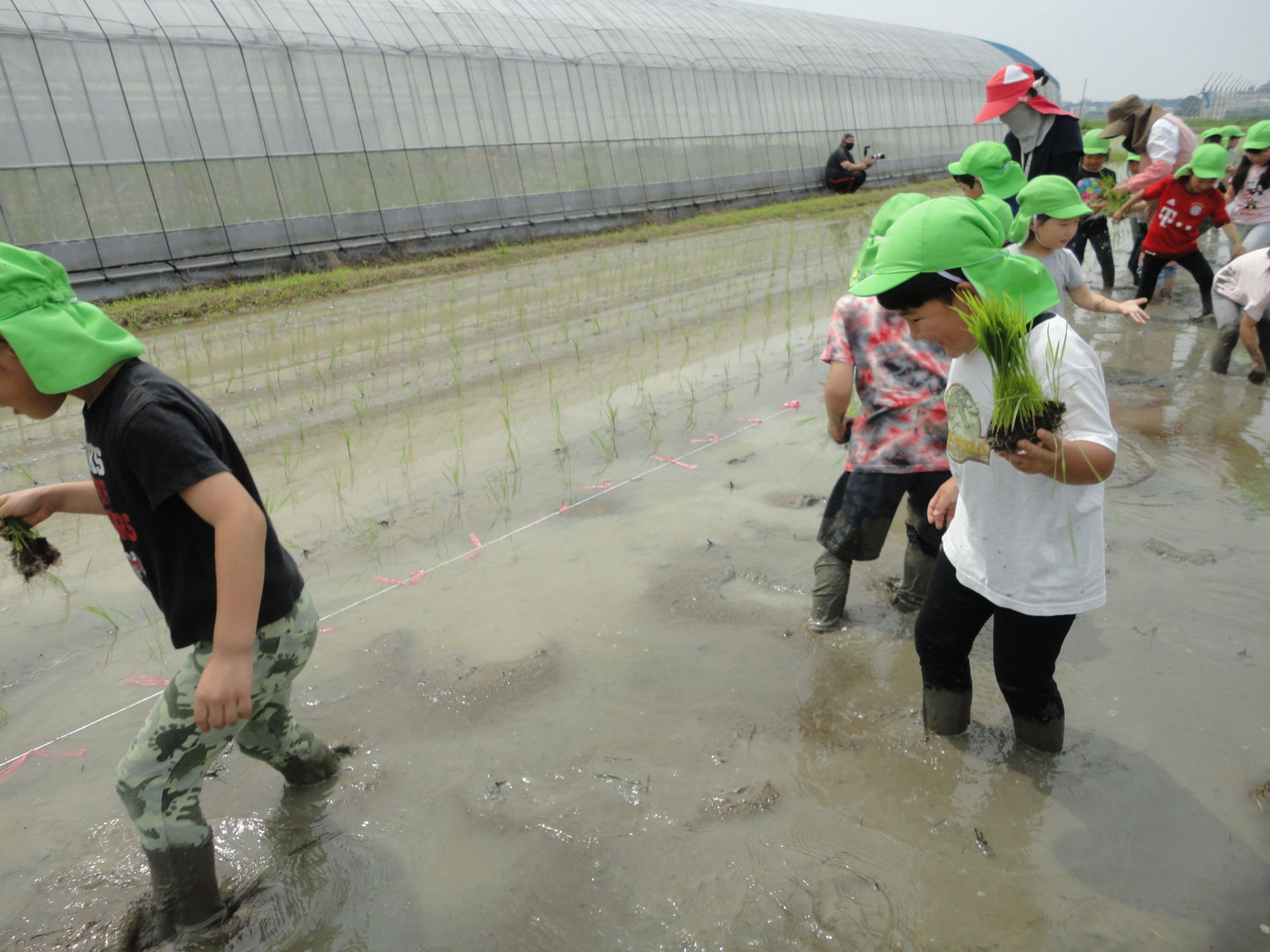 4~5本の苗の束をロープの目印に合わせて、上手に植えていきました♪