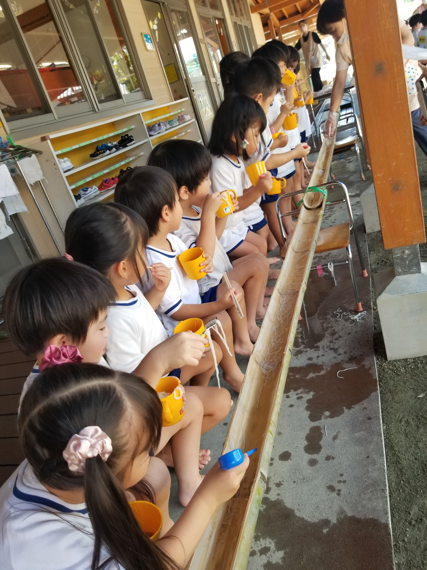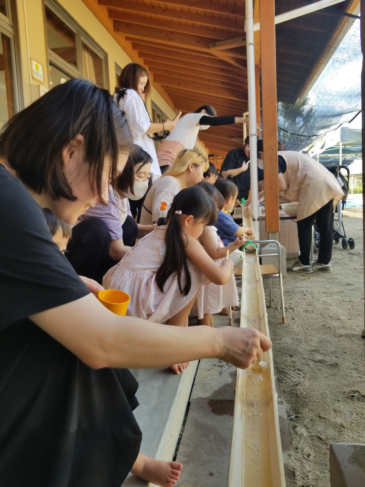 そうめんが流れてくると、「うわー!!きたーーー!!」と、興奮しつつも、すくうのに必死でとても真剣な表情の子ども達!💨