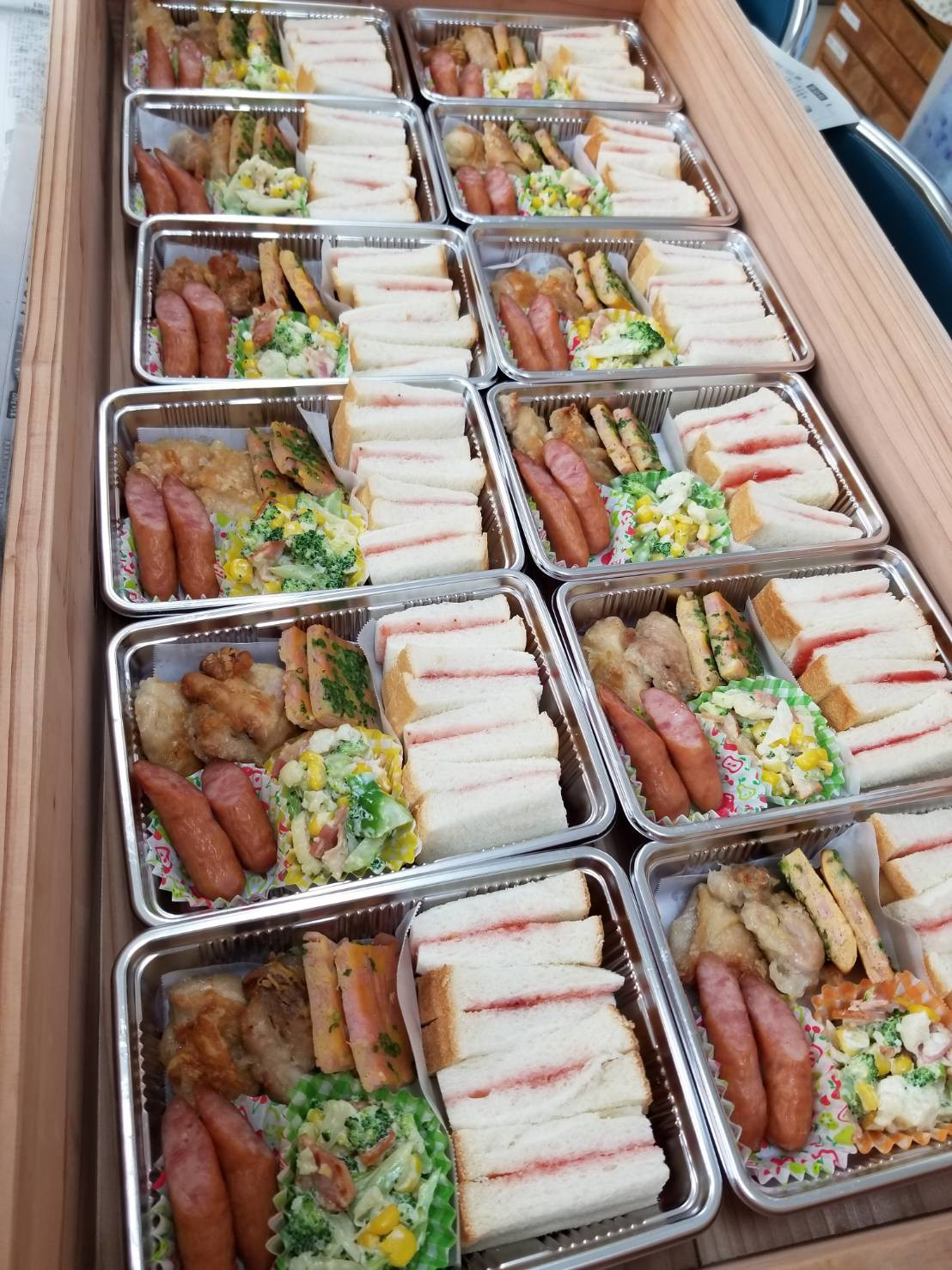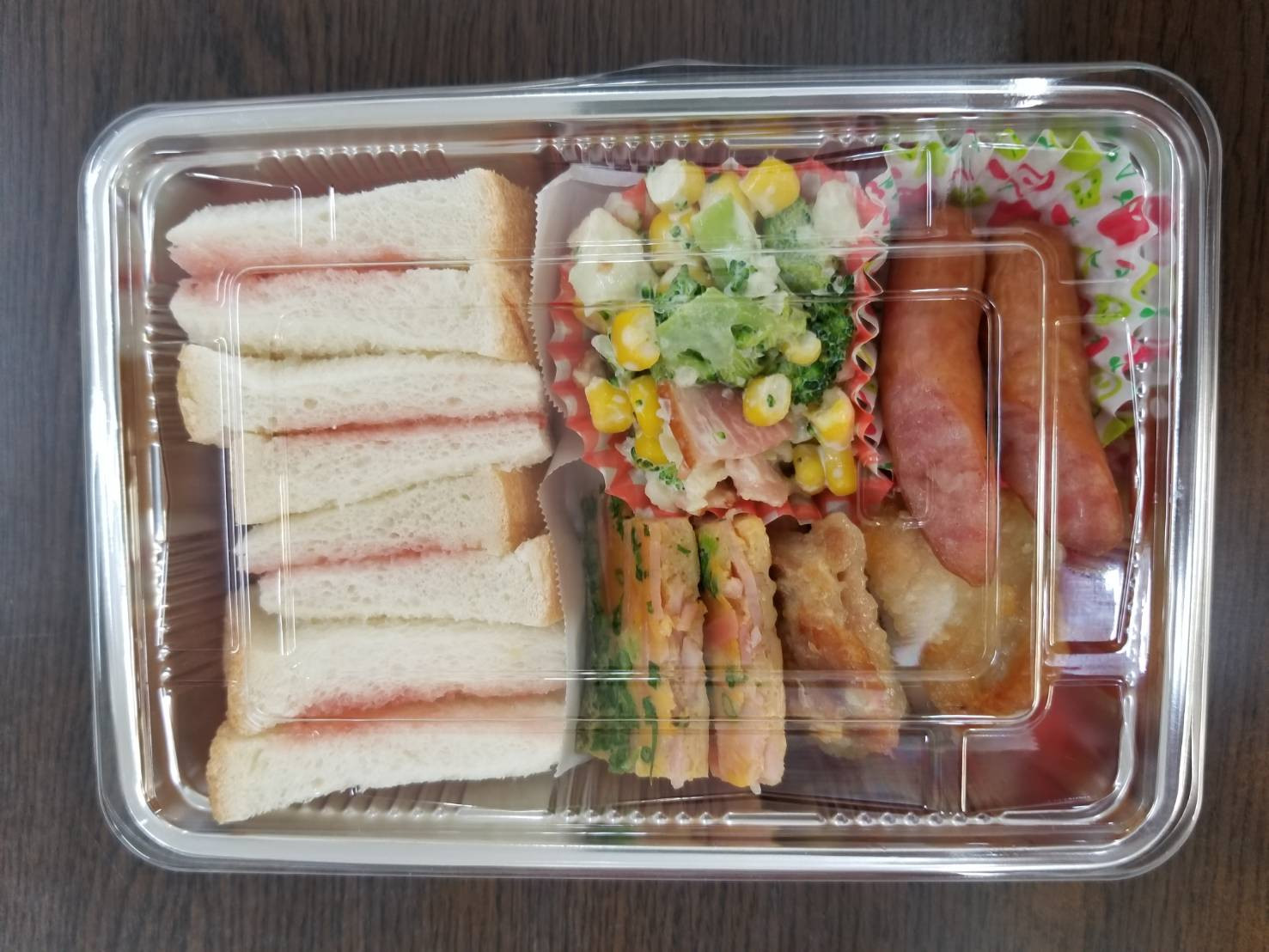 ジャムサンドイッチ、からあげ・ソーセージ・玉子焼き・サラダと子ども達の大好きなものが入っていて「美味しい~!!」とペロリと食べていました(#^^#)