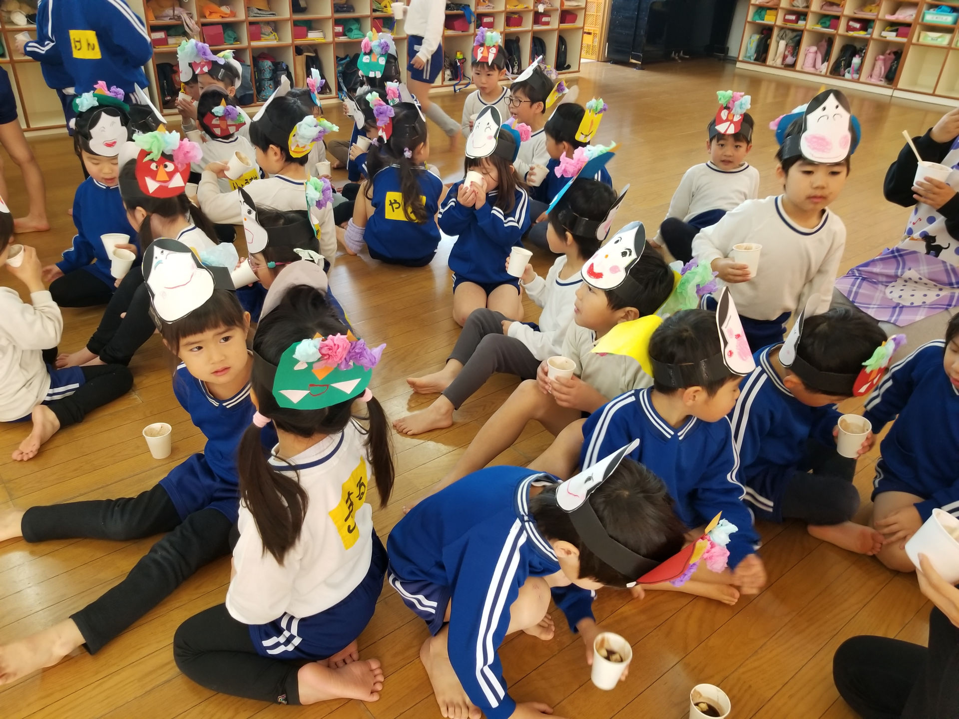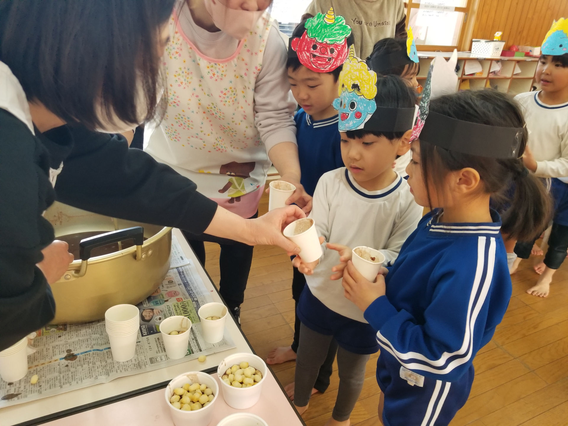 鬼さんが去った後は、父母と先生の会で用意したぜんざいを食べて