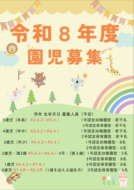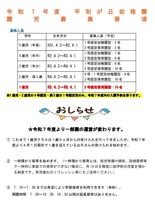 令和7年度 園児募集人員のお知らせ。