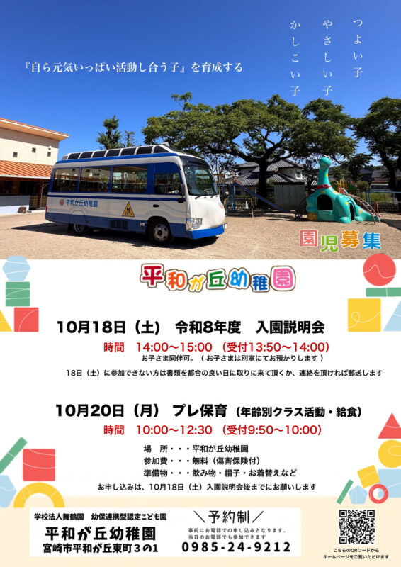 本日、令和8年度入園説明会を行いました!ご参加ありがとうございました😊 本日の説明会に参加できなかった方は、資料の郵送も行いますので、幼稚園にお問い合わせください☎0985-24-9212個別で園見学もお受けしてますよ […]